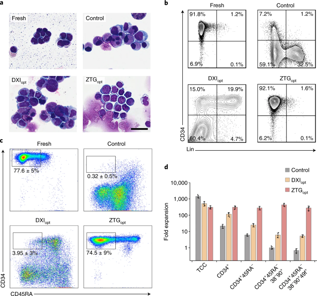 Researchers used ZTG opt and optimized Delta1 ext-IgG (DXI) as an unmodified TCPS culture flask to culture HSPC separately. They found that after ZTG opt culture, the original cell homogeneity of the HSPC was preserved, while DXI and The culturing methods of TCPS culture flasks will lead to heterogeneous phenotypes such as granular cytoplasm and irregular nuclei. As shown in Figure 2, during the entire culture period, the ZTG opt population maintained high CD34 expression, and CD34+ in the cells amplified by ZTG opt accounted for 93.7%±2%, indicating that the ZTG hydrogel 3D culture method can inhibit HSPC differentiation.